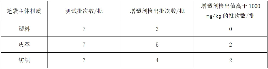 以主体材质分类,将笔袋分为塑料、皮革(含PU皮革)、纺织笔袋三类,其中7批次塑料材质笔袋中有3批次有检出值,结果分别为100 mg/kg、40.6 mg/kg、15.8 mg/kg,明示塑料材质分别为PVC、EVA、PVC,生产企业分别为杭州**文化发展股份有限公司、**集团股份有限公司、上海**文具股份有限公司。7批次皮革材质笔袋中有5批次有检出值,其中2批次的检测值大于1000 mg/kg,结果分别为91533 mg/kg和6646 mg/kg(分别为同一批次笔袋的2个部位,外侧米色皮料和棕色纺织内衬)、15084 mg/kg。7批次纺织面料笔袋中有4批次有检出值,其中2批次的检测值大于1000 mg/kg,结果分别为25809 mg/kg、9260 mg/kg,其中9260 mg/kg对应的笔袋测试部位为外侧蓝色面料(带黑色内涂层),由于内层塑料涂层无法剥离,因此与外侧纺织面料同时进行了测试。3种材质笔袋增塑剂检出结果比对见表3。