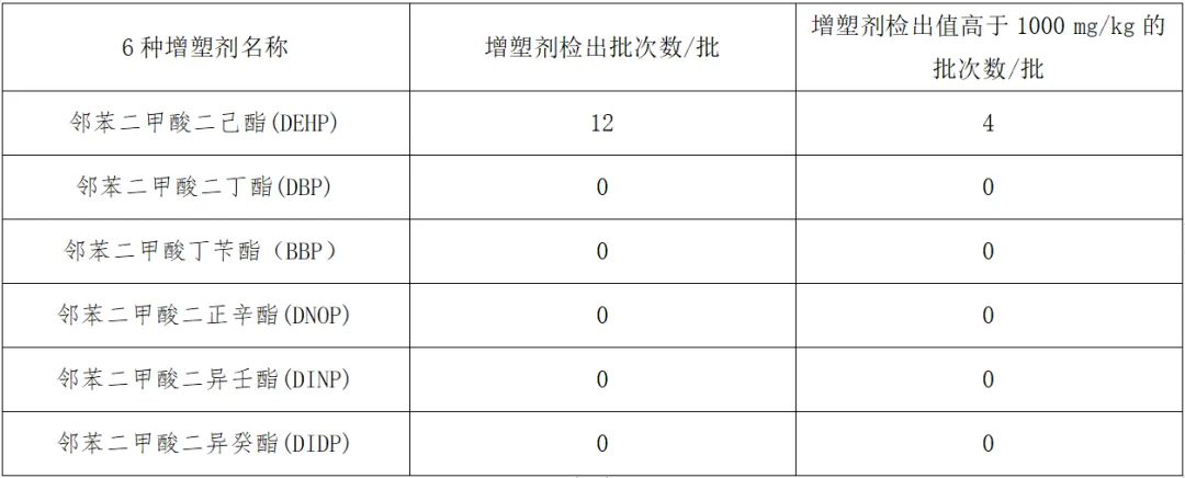 参考GB 21027-2020标准中3种增塑剂1000 mg/kg的限量要求,本次测试的21批次产品中,有12批次产品检出增塑剂,有4批次产品6种增塑剂的总量超过1000 mg/kg,且均为邻苯二甲酸二(2-乙基)己酯(DEHP)检出。